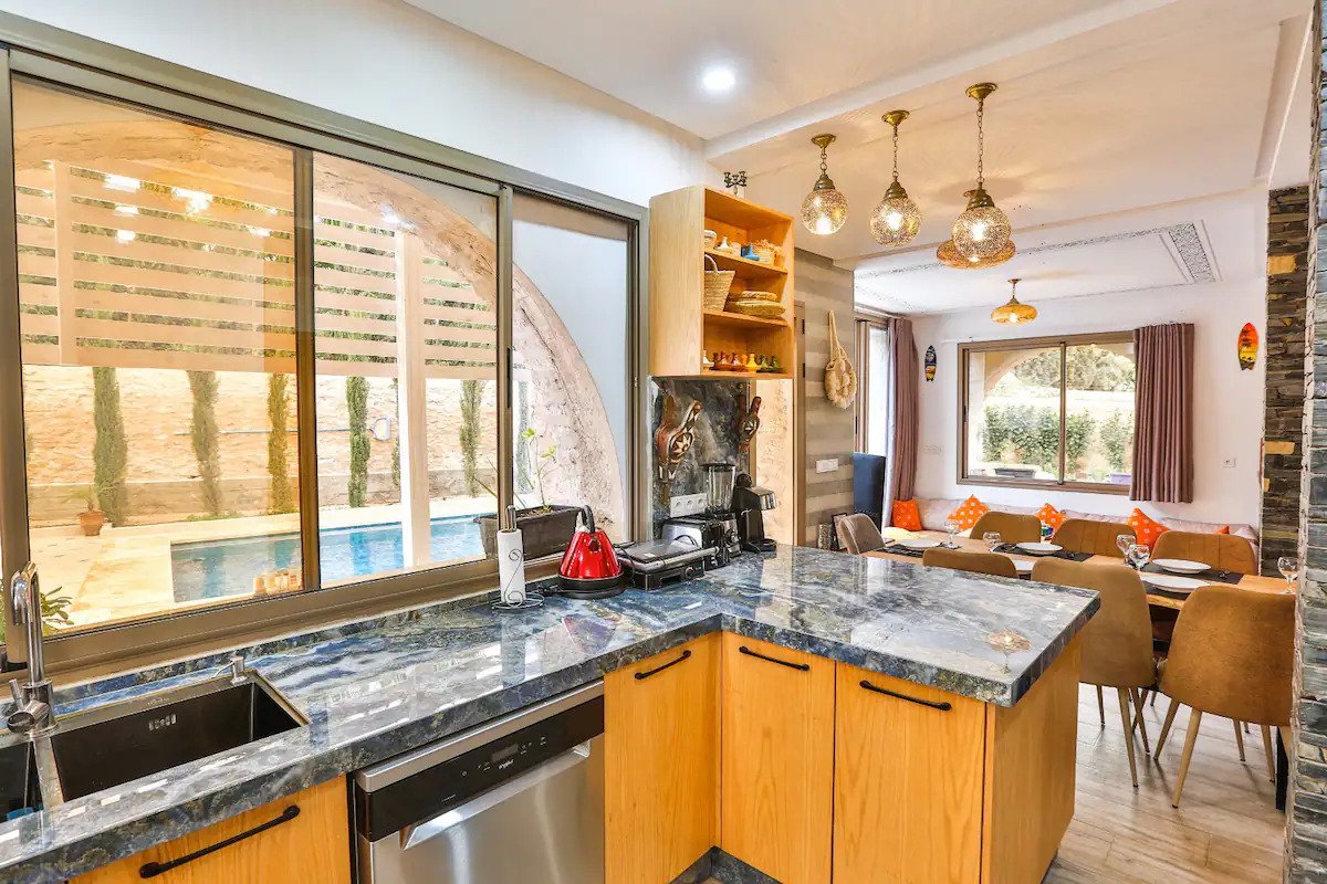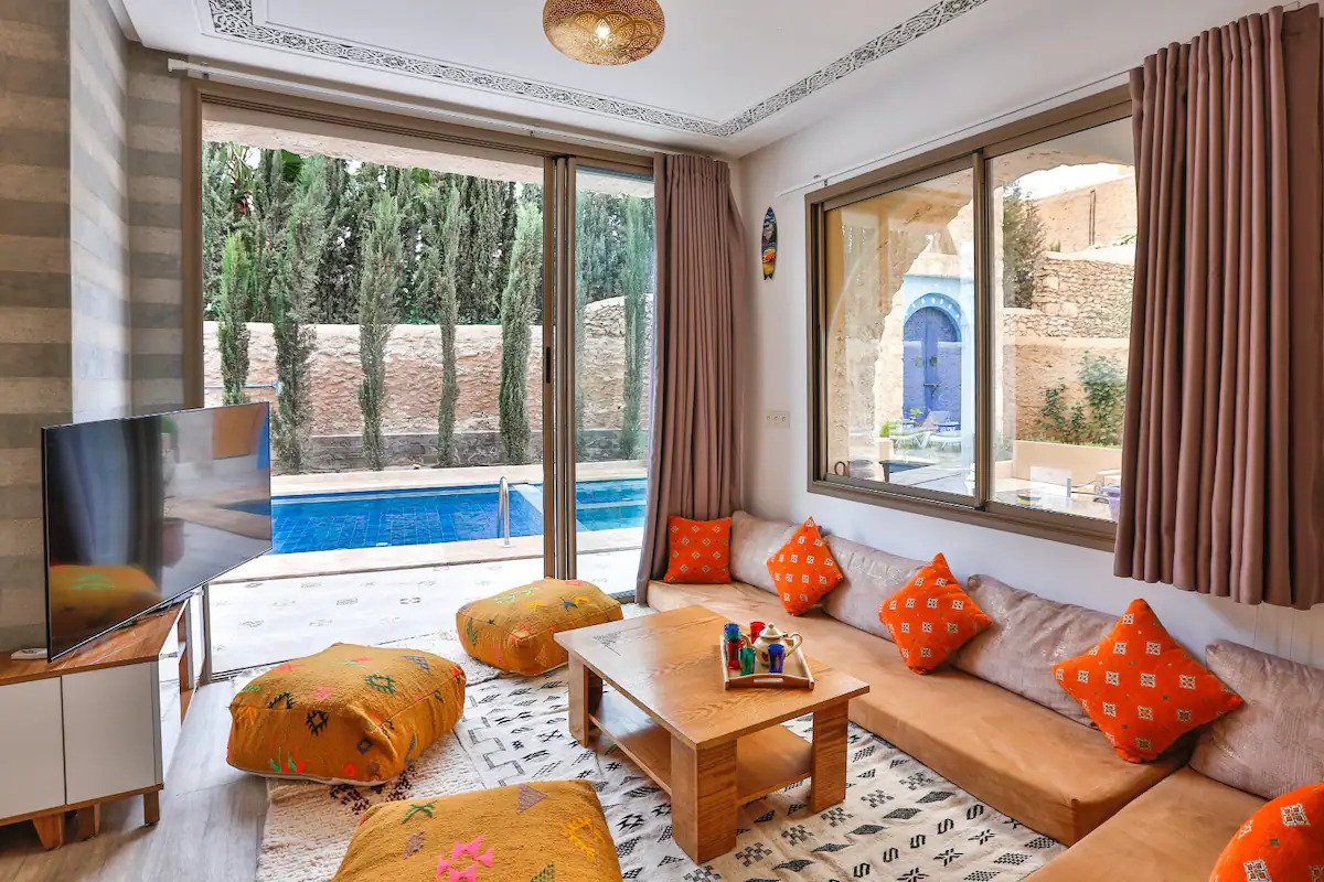 À l’extérieur, la piscine privée et le jardin offrent un espace idéal pour se détendre sous le soleil d’Essaouira. Cette villa avec piscine à Essaouira est pensée pour offrir une expérience exclusive.