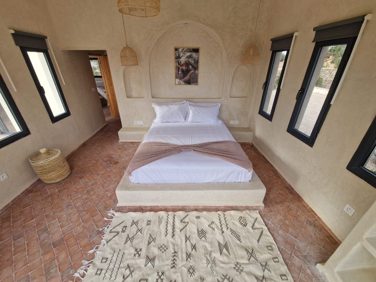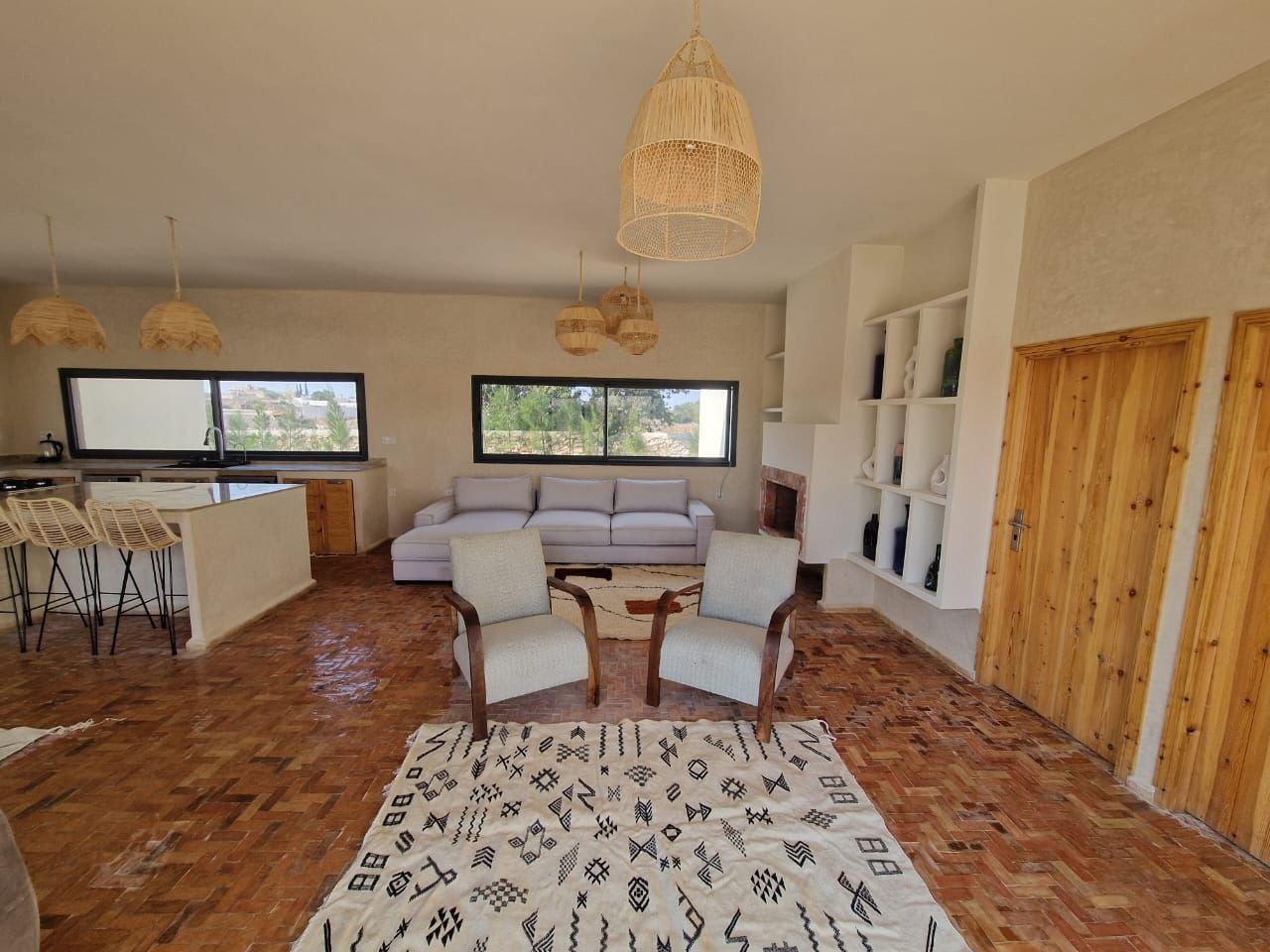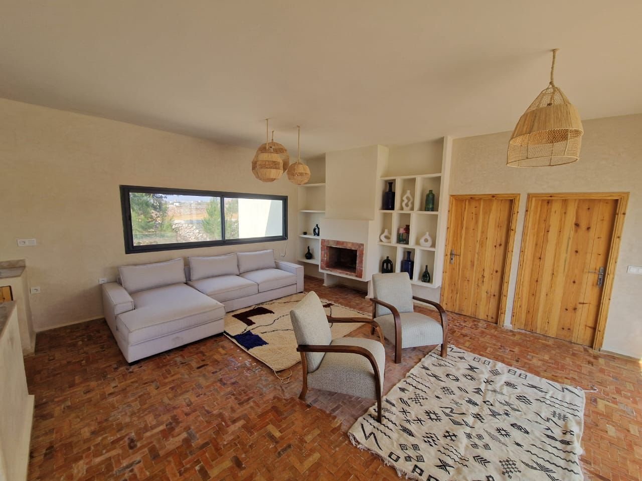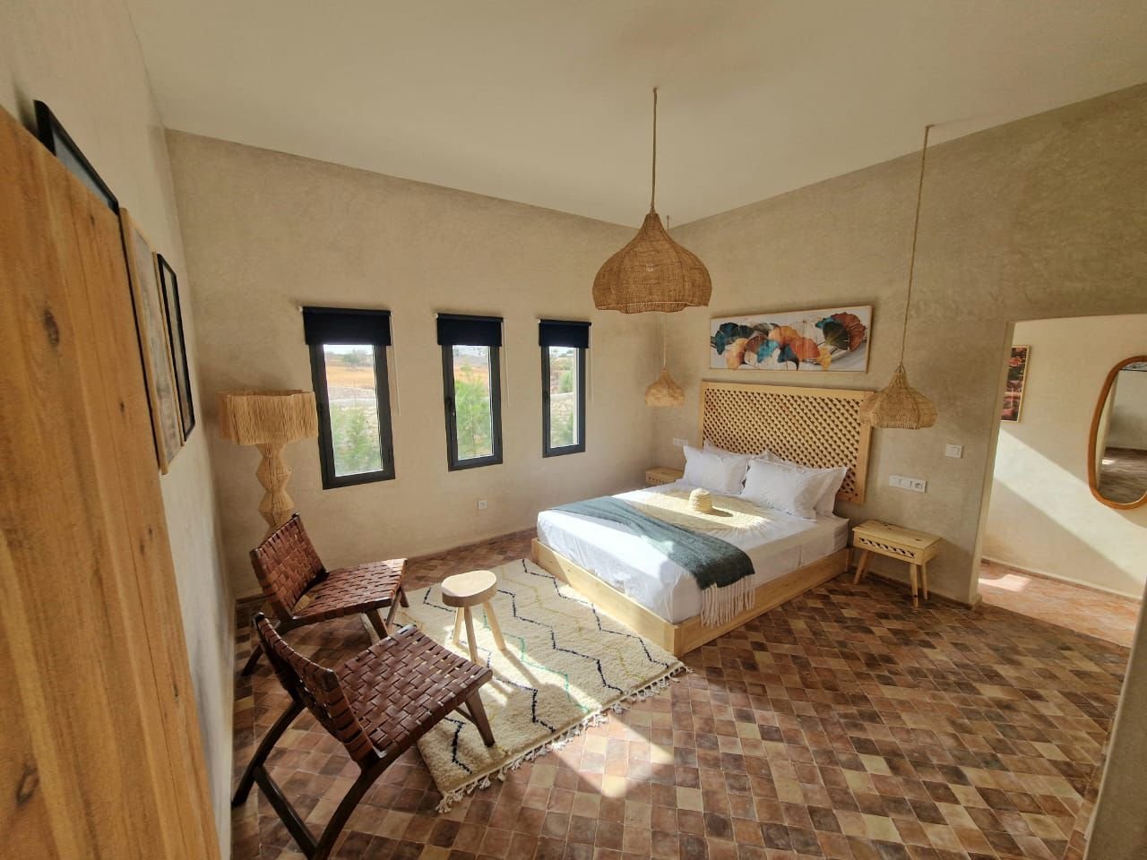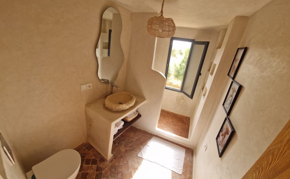 La villa dispose de quatre chambres spacieuses, chacune aménagée avec soin pour garantir un maximum de confort. Les espaces de vie sont lumineux et ouverts, offrant une atmosphère chaleureuse et conviviale. Le salon principal, décoré avec goût, invite à la détente après une journée à la plage ou une excursion dans la région d’Essaouira.
