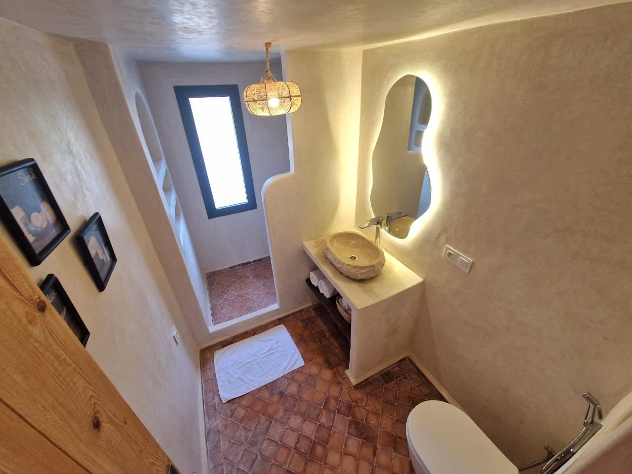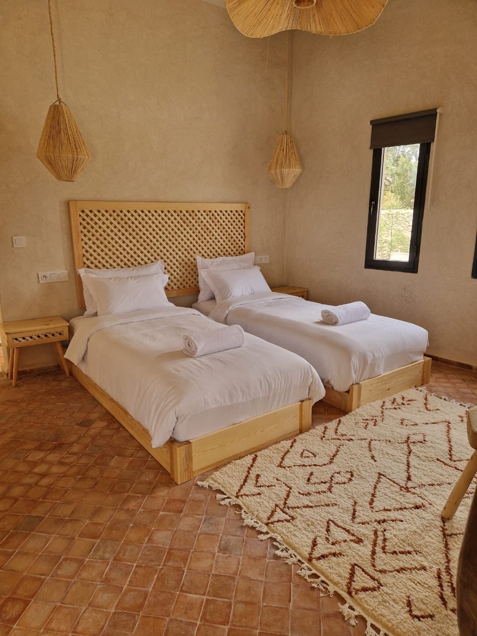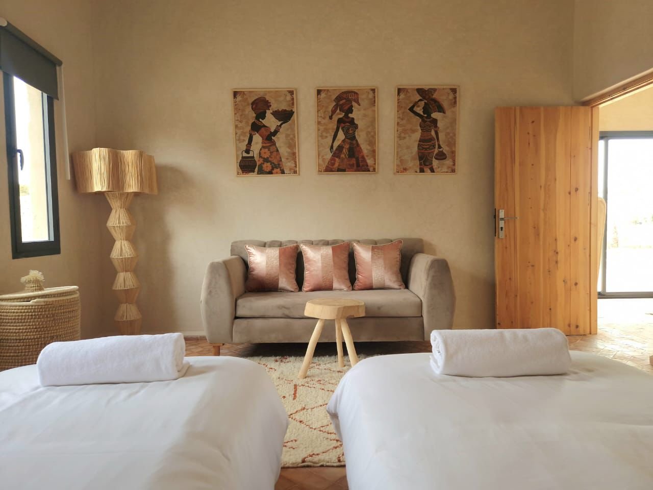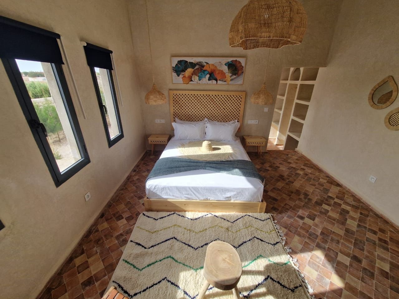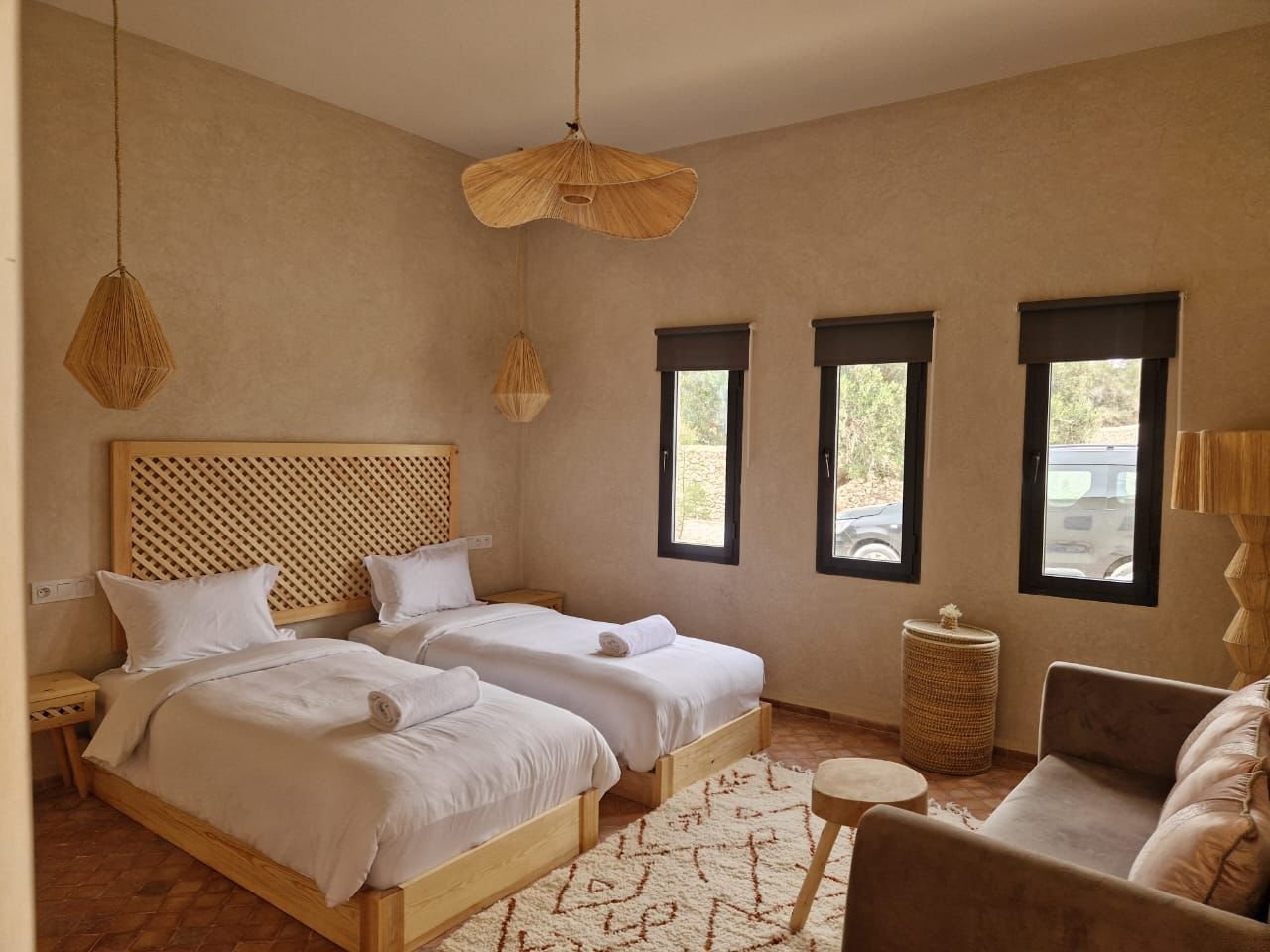 La villa dispose de quatre chambres spacieuses, chacune aménagée avec soin pour garantir un maximum de confort. Les espaces de vie sont lumineux et ouverts, offrant une atmosphère chaleureuse et conviviale. Le salon principal, décoré avec goût, invite à la détente après une journée à la plage ou une excursion dans la région d’Essaouira.